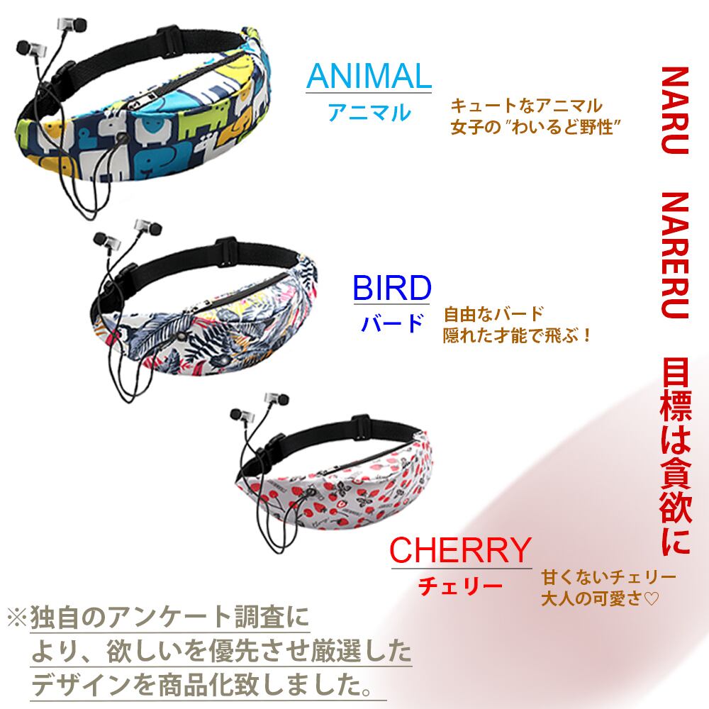 【商品仕様】〇カラー:ネイビー、フラワー、チェック、アニマル、バード、チェリー 〇サイズ:バック 11cm×45cm×6cm、バンド 最大60cm、ウエスト調節範囲:70cm~105cm 〇素材:ポリステル 〇重量:45g 〇仕様:撥水加工、内ポケット×1 〇ブランド:M&CRYSTA (エムアンドクリスタ)
