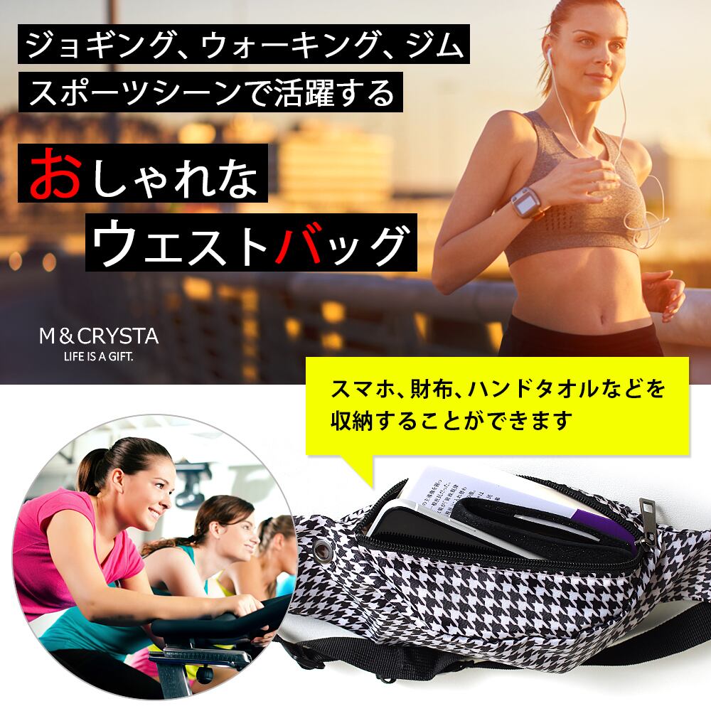 【おしゃれなウエストポーチ】女性のスポーツシーンで大活躍◎おしゃれなデザインのウエストポーチです。ジョギング、ウォーキング、ジムなど、スポーツシーンで便利に荷物を持ち運び。スマホ、小銭入れ、ハンドタオルなどを収納することができます。ウエスト調整範囲は70cm~105cm。ぴったりのサイズに調整が可能です。
